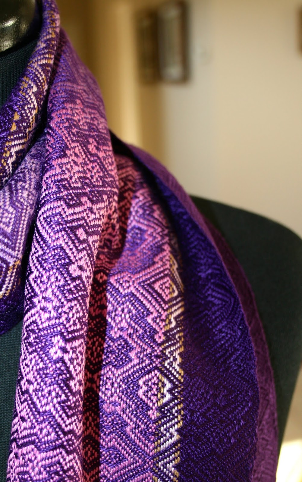 two ombre scarves from the Megado loom. Once again, being able to change the tie up / treadling arrangement 'on the fly' saved the day. The scarf with the black weft sold quickly and I suspect it became someone's Christmas gift and the scarf, while the scarf with eggplant weft is still here for now. I really like it and thinking of keeping it for myself.