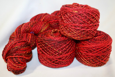 I have 'borrowed' these images from Fellview's web site as I failed to get decent pictures of the rolags before spinning. You can see how rich the colorway is. It's a fine micron merino and tussah silk and a touch of ruby bamboo.