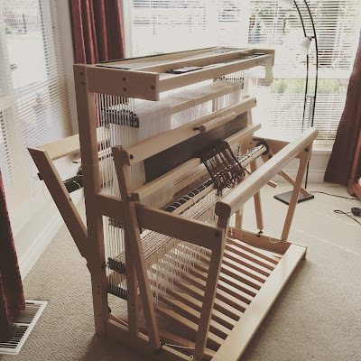 Tie ups are straightforward but the loom can be carefully lifted up onto crates and then sit to do the tie up. The photo above shows my current and last shawl project nearly completed, so it's all tied up for a lovely 8 shaft huck lace and I will leave this tie up in place and provide a copy of the draft. Wind and beam a warp, and weave right away.